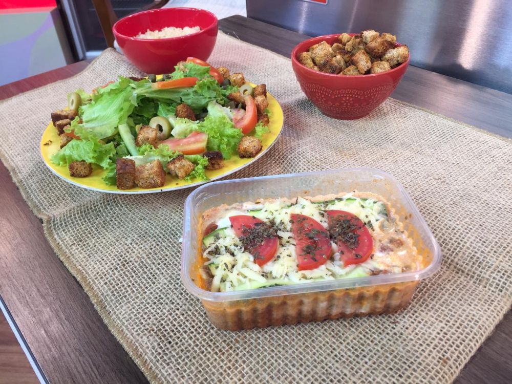 Em um refratário coloque um pouco de molho, uma camada de abobrinha, uma camada de molho, uma camada de queijo, uma camada de creme de leite (coloque toda a caixa), abobrinha, molho, queijo, decore com fatias de tomate e salpique orégano a gosto. Leve ao forno pré-aquecido por 15 a 20 minutos.