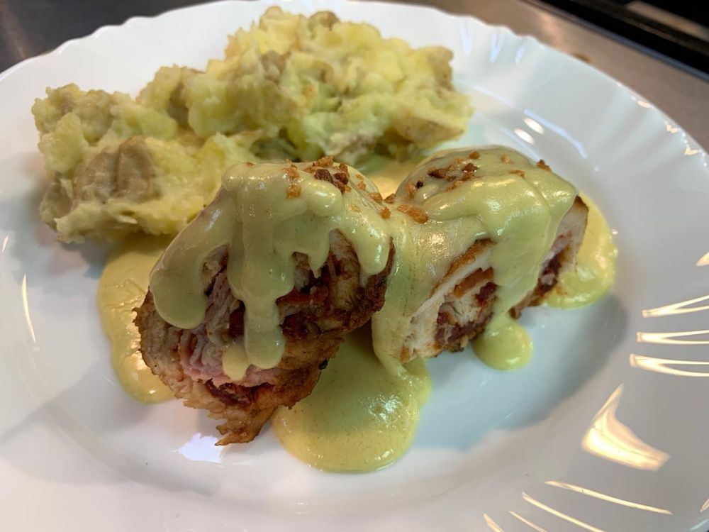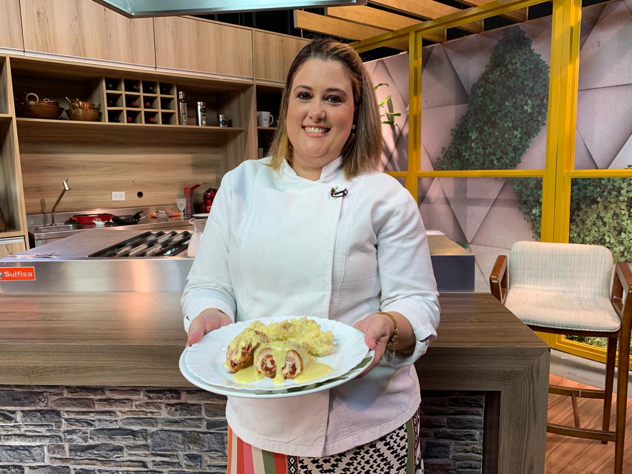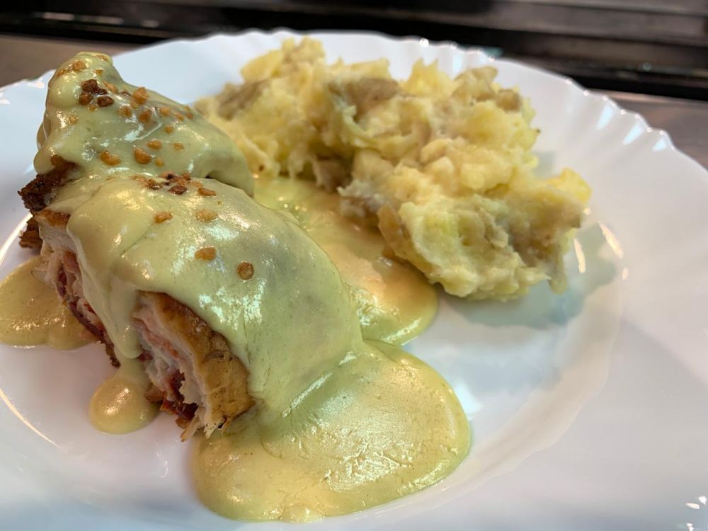 Envoltine de frango ao molho de leite de coco e mostarda com purê de batata rústica