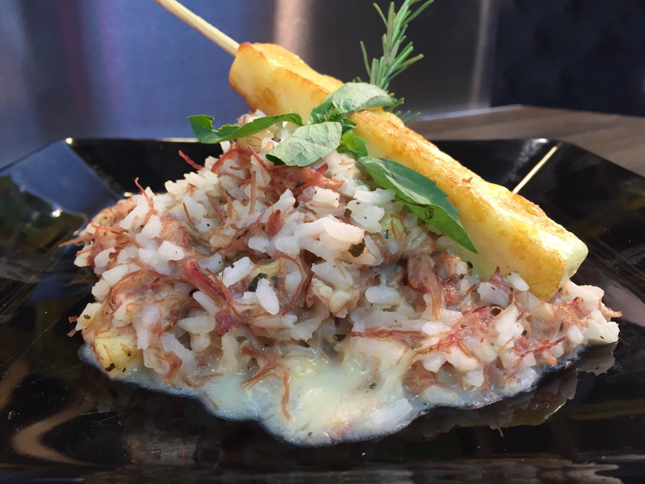 Coloque uma porção do risoto, acrescente o crispy de cebola por cima o espeto de queijo coalho e um raminho de alecrim.