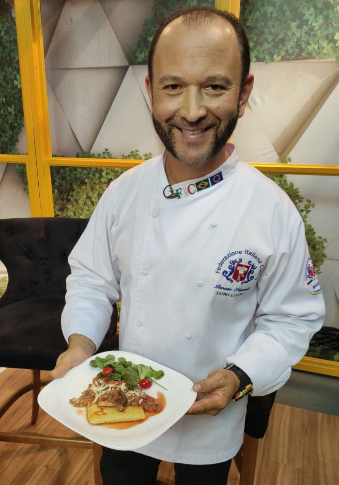 Junte na água ainda fria, a sêmola de milho, sal, manteiga e o tablete de caldo de carne bem picado. Deixe cozinhar em fogo médio, por cerca de 20 minutos, mexendo constantemente até dar o ponto. Unte uma forma retangular com azeite, disponha a polenta ainda quente no fundo e espalhe bem. Deixe uma camada de aproximadamente dois centímetros de espessura. Deixe esfriar e leve à geladeira.
