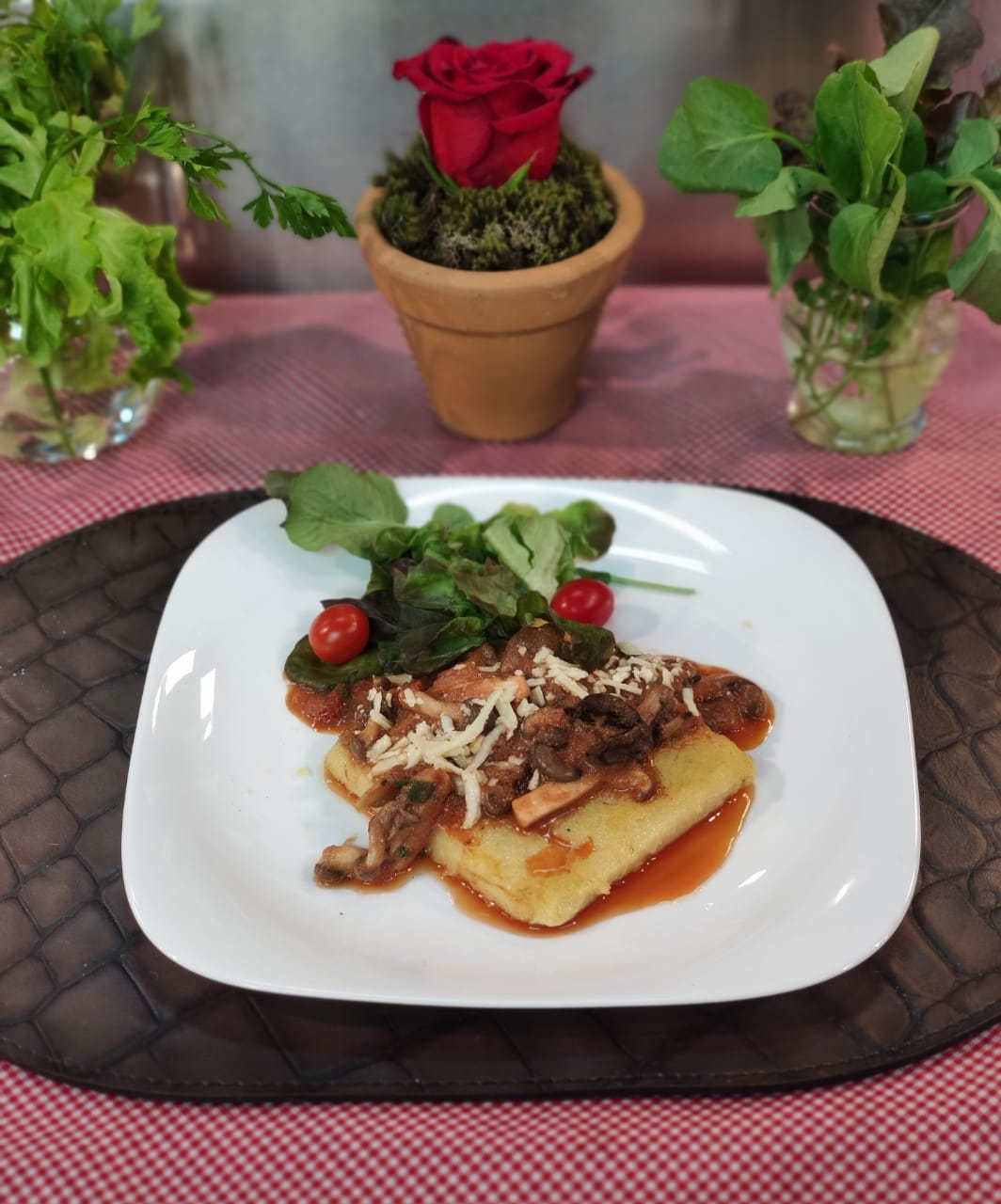 Doure o alho no azeite, acrescente os tomates pelados, orégano, páprica, sal e deixe apurar brevemente. Limpe os cogumelos frescos com um pano seco, pique-os grosseiramente e incorpore ao molho. Lave bem os cogumelos secos, hidrate-os em água morna por cerca de 20 minutos, pique-os e junte-os ao molho. Deixe apurar por uns 5 minutos. Corte a polenta em quadrados de cerca de 10 centímetros, polvilhe com parmesão e leve ao forno alto para gratinar, cerca de 5 minutos. Disponha cada crostini de polenta no prato, regue com o molho e finalize com um fio de azeite. Sirva com salada de folhas e tomates uva.