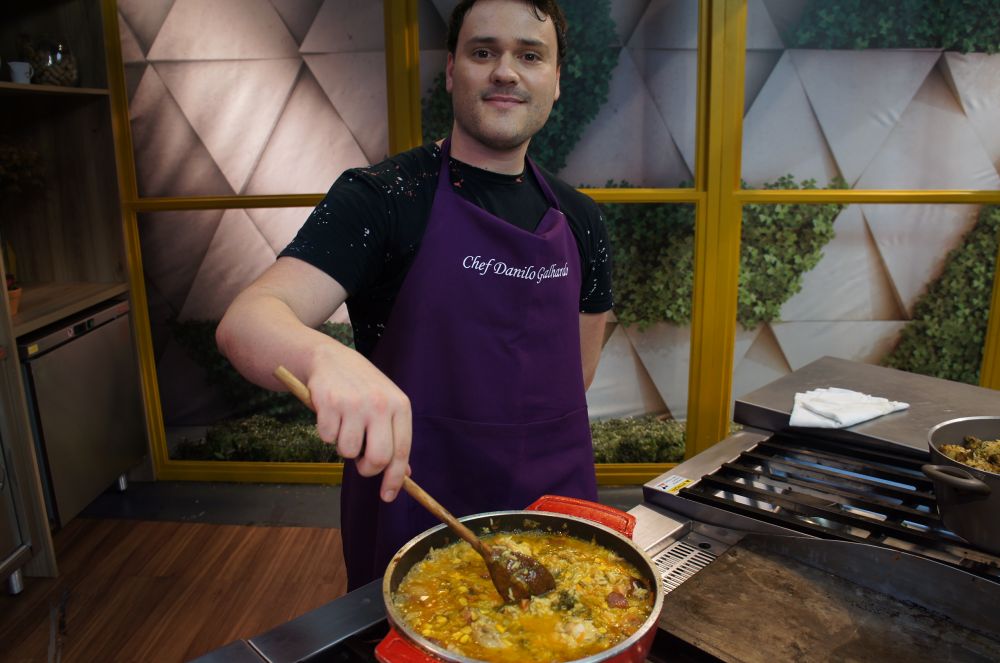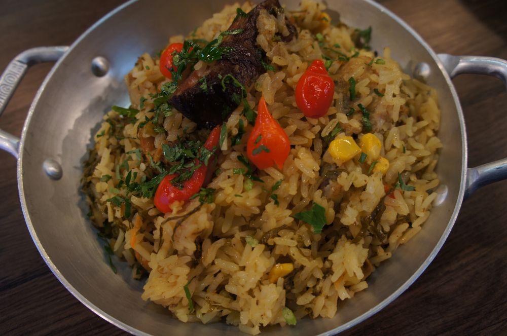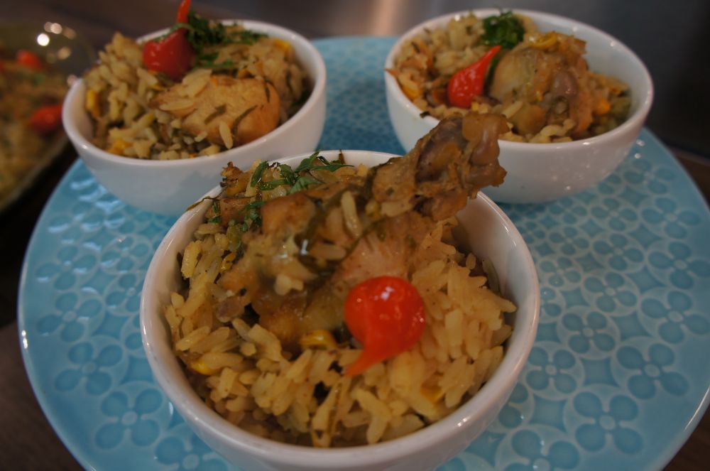 Temperar o frango com sal, limão, páprica e açafrão da terra. Em uma panela, esquentar o óleo e dourar bem o frango salpicando farinha de trigo. Depois de dourar o frango, reservar. Na mesma panela, dourar o bacon, o alho, a cebola, a cenoura, o tomate e a couve. Voltar com o frango, colocar o caldo, o arroz e cozinhar até o arroz ficar macio. Finalizar com o milho e o cheiro verde.