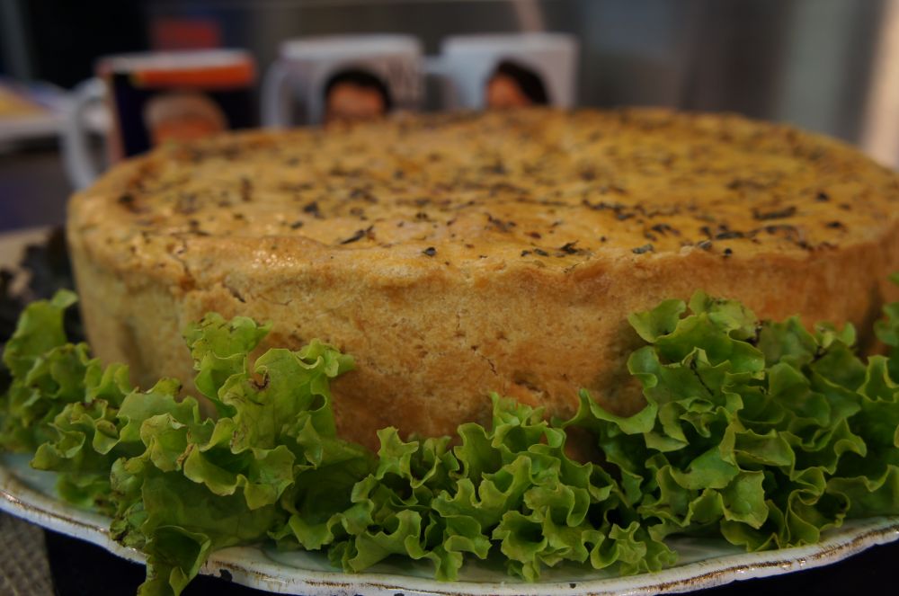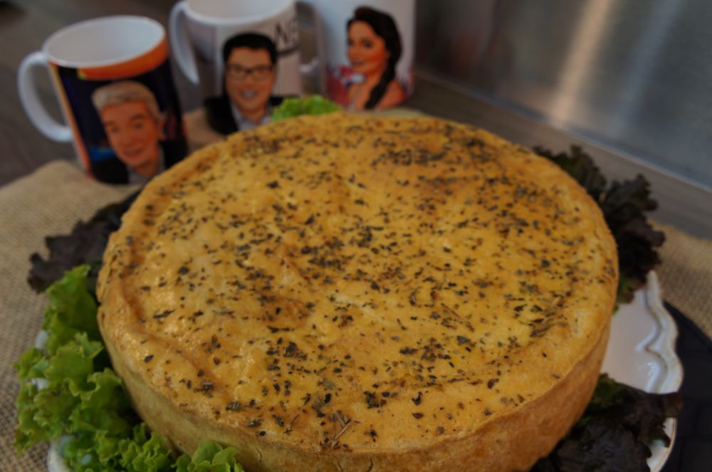 Finalização. Com a ajuda de um rolo e plástico filme, estique a massa até ficar no tamanho da forma. Cubra o empadão e junte as massas apertando levemente nas laterais da forma. Em um ramekin coloque óleo é uma gema de ovo, misture e coloque em cima do empadão para dar cor pós-assado. Finalize com orégano!