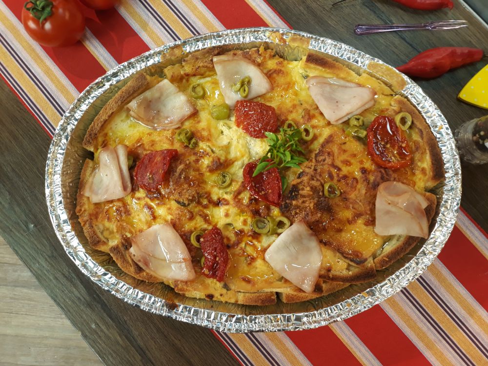 Para o creme coloque todos os ingredientes em uma panela e cozinhe por 2 minutos. Em uma assadeira derrame metade deste creme, aí intercale com camadas de pão e elementos do recheio até que finalize com pão. Por fim derrame a outra metade do creme, polvilhe parmesão e leve ao forno quente (200º) apenas para dourar.