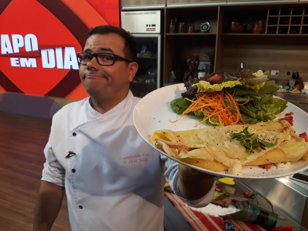 Para a massa da sua crepioca coloque em uma vasilha todos os ingredientes, misture com um garfo e derrame em sua frigideira Frigigold aquecida sem colocar NADA DE ÓLEO. Aí coloque a tampa e mantenha por 30 segundo. Em seguida retire a tampa, vire a crepioca e espalhe o recheio. Enrole e mantenha por 30 segundo de cada lado afim de que o recheio aqueça. Sirva com uma saladinha verde.